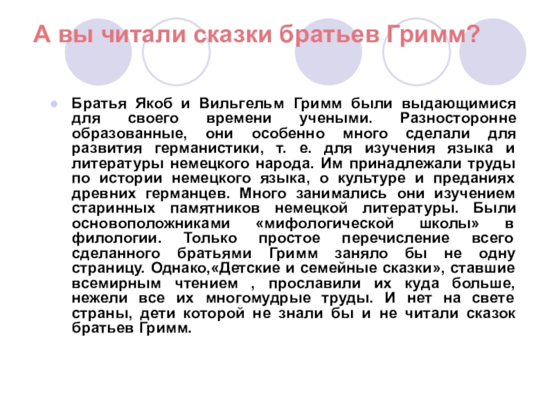 выдающимися для своего времени учеными. Разносторонне образованные, они особенно много сделали для развития германистики, т. е. для изучения языка и литературы немецкого народа. Им принадлежали труды по истории немецкого языка, о культуре и преданиях древних германцев. Много занимались они изучением старинных памятников немецкой литературы. Были основоположниками «мифологической школы» в филологии. Только простое перечисление всего сделанного братьями Гримм заняло бы не одну страницу. Однако,«Детские и семейные сказки», ставшие всемирным чтением , прославили их куда больше, нежели все их многомудрые труды. И нет на свете страны, дети которой не знали бы и не читали сказок братьев Гримм.
