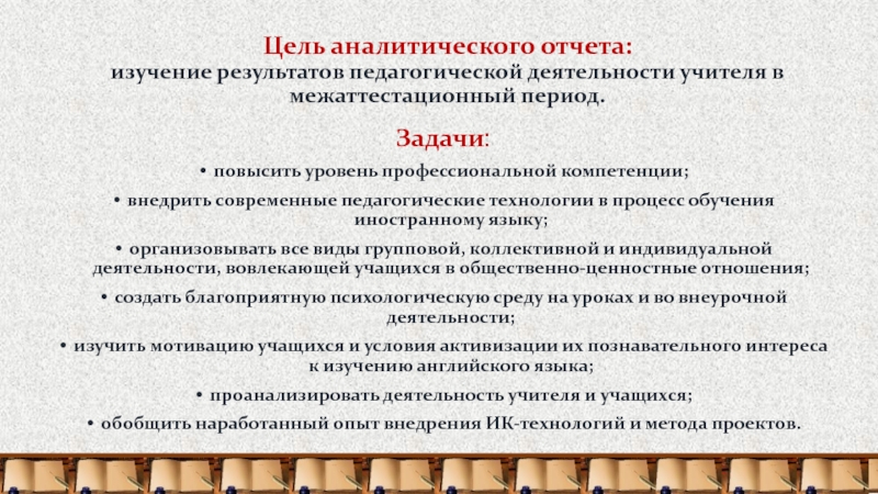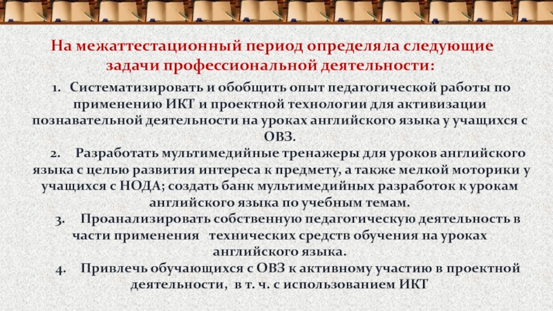 Слайд 5 На межаттестационный период определяла следующие задачи профессиональной деятельности: