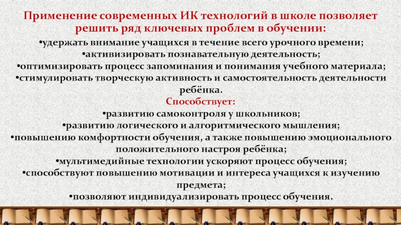 Слайд 13Применение современных ИК технологий в школе позволяет решить ряд ключевых проблем