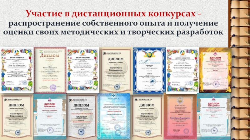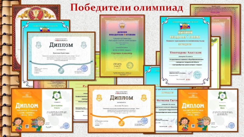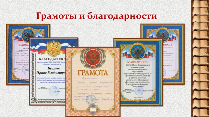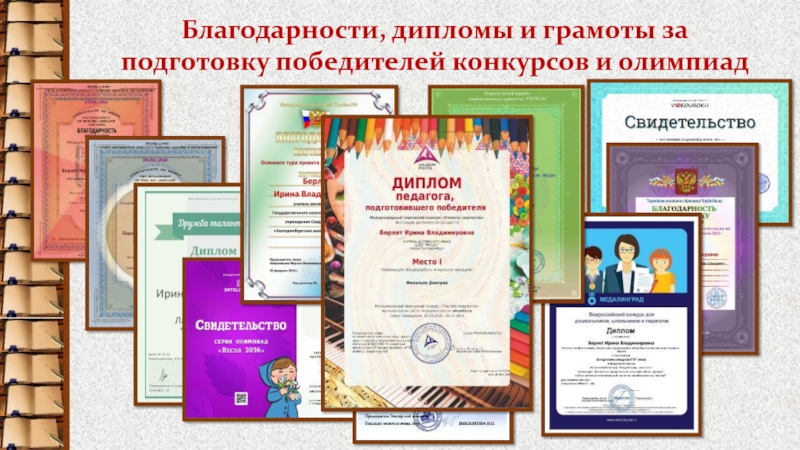 Слайд 35Благодарности, дипломы и грамоты за подготовку победителей конкурсов и олимпиад