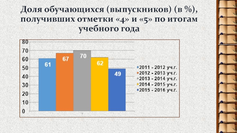 Слайд 29Доля обучающихся (выпускников) (в %), получивших отметки «4» и «5» по