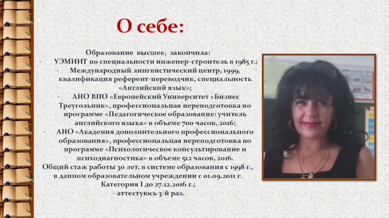 Общий стаж работы 30 лет, в системе образования с 1998 г.,