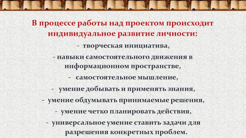 Слайд 18В процессе работы над проектом происходит индивидуальное развитие личности:
