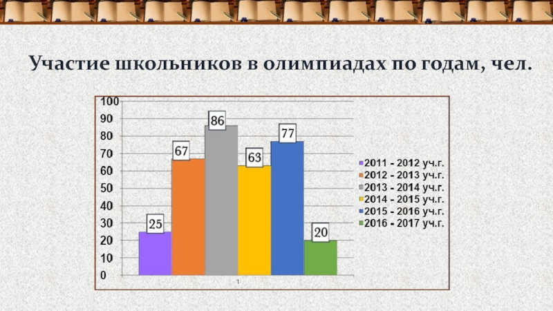Слайд 30Участие школьников в олимпиадах по годам, чел.