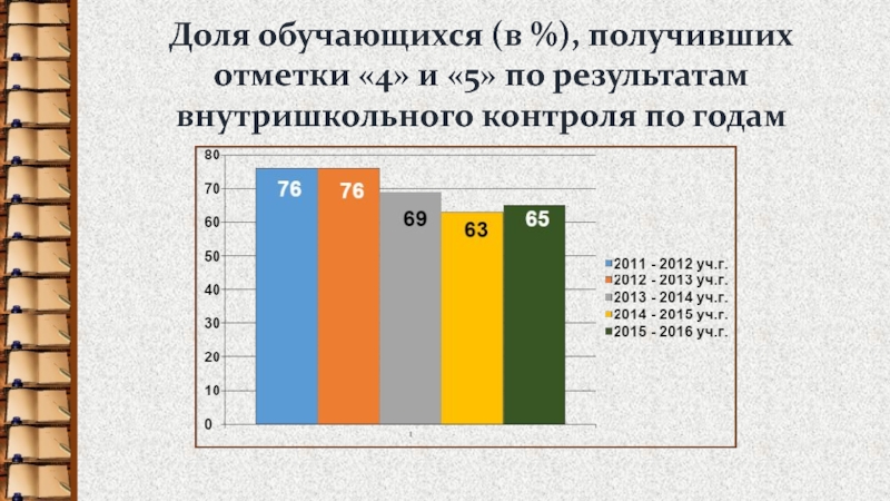 Слайд 27Доля обучающихся (в %), получивших отметки «4» и «5» по результатам