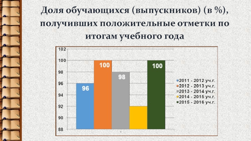 Слайд 28Доля обучающихся (выпускников) (в %), получивших положительные отметки по итогам учебного