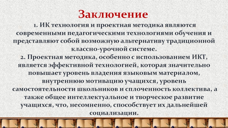 2. Проектная методика, особенно с использованием ИКТ, является эффективной технологией, которая значительно повышает уровень владения языковым материалом, внутреннюю мотивацию учащихся, уровень самостоятельности школьников и сплоченность коллектива, а также общее интеллектуальное и творческое развитие учащихся, что, несомненно, способствует их дальнейшей социализации.