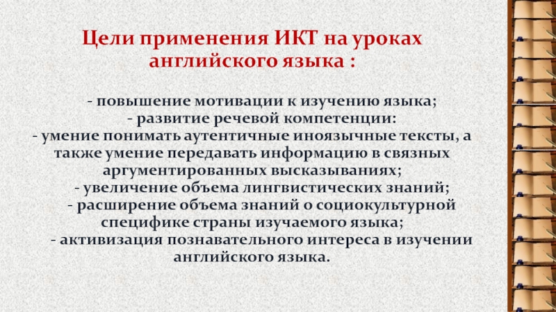 Слайд 12Цели применения ИКТ на уроках английского языка :