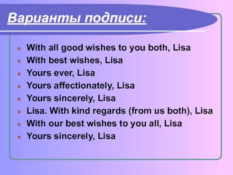 8. В конце письма не забудь написать завершающую фразу Best wishes (С наилучшими пожеланиями) или Love (Целую) на отдельной строке.