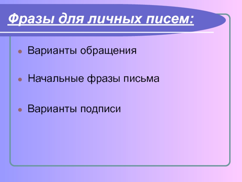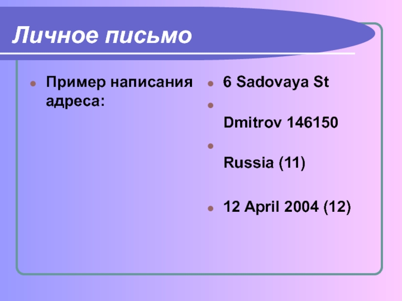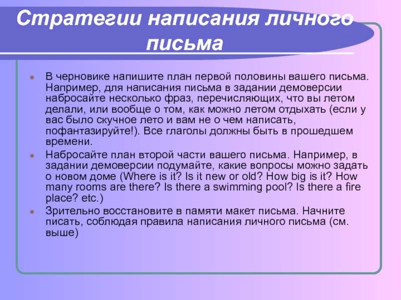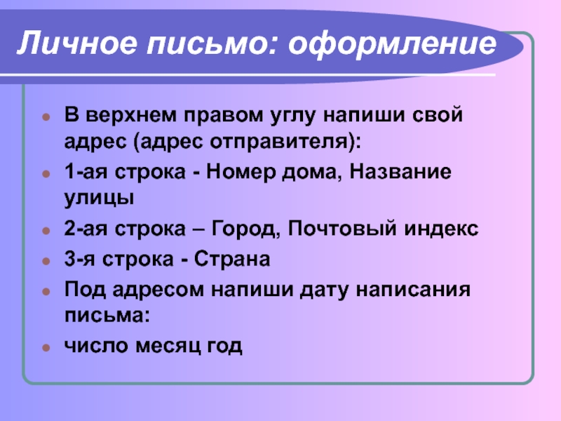 Зрительно восстановите в памяти макет письма. Начните писать, соблюдая правила написания личного письма (см. выше)