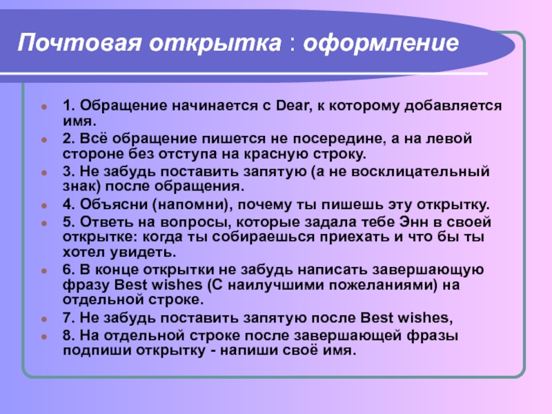6. В конце открытки не забудь написать завершающую фразу Best wishes (С наилучшими пожеланиями) на отдельной строке.
