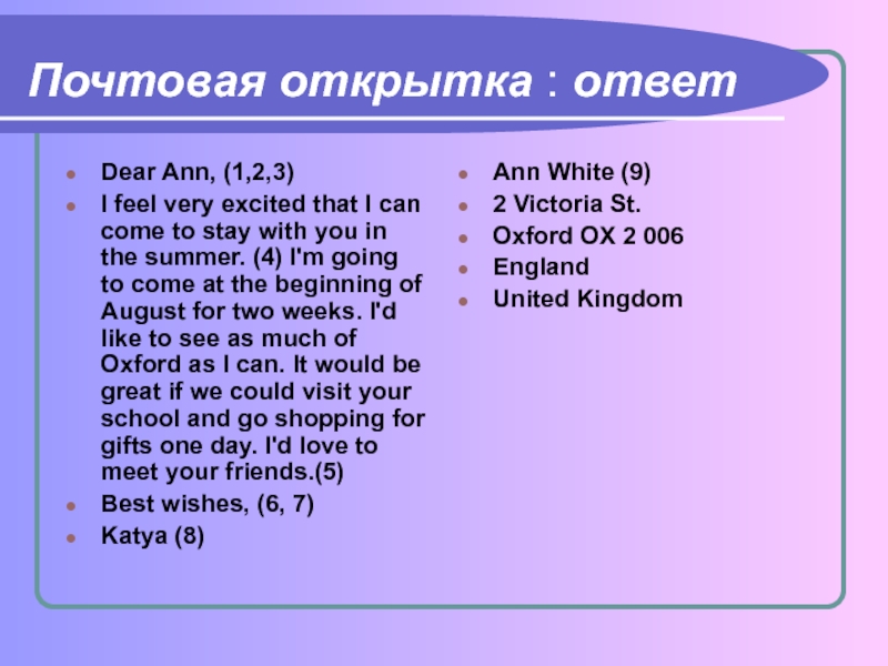 5. Ответь на вопросы, которые задала тебе Энн в своей открытке: когда ты собираешься приехать и что бы ты хотел увидеть.