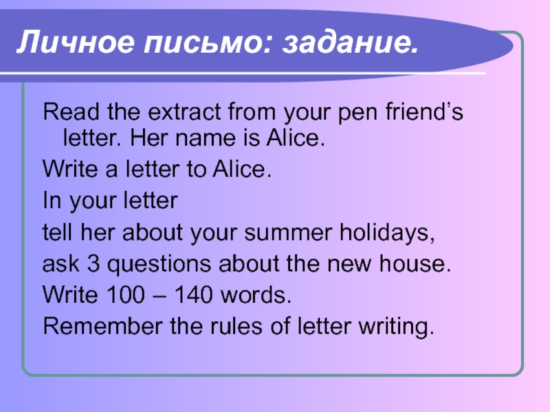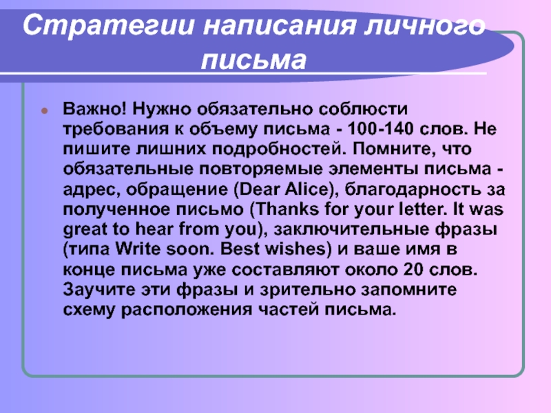 письма - 100-140 слов. Не пишите лишних подробностей. Помните, что обязательные повторяемые элементы письма - адрес, обращение (Dear Alice), благодарность за полученное письмо (Thanks for your letter. It was great to hear from you), заключительные фразы (типа Write soon. Best wishes) и ваше имя в конце письма уже составляют около 20 слов. Заучите эти фразы и зрительно запомните схему расположения частей письма.