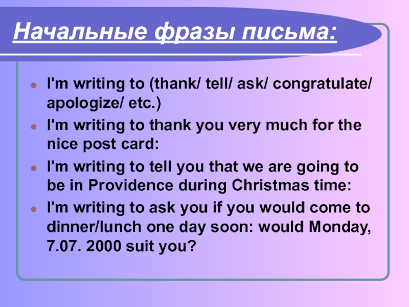 I'm writing to (thank/ tell/ ask/ congratulate/ apologize/ etc.)