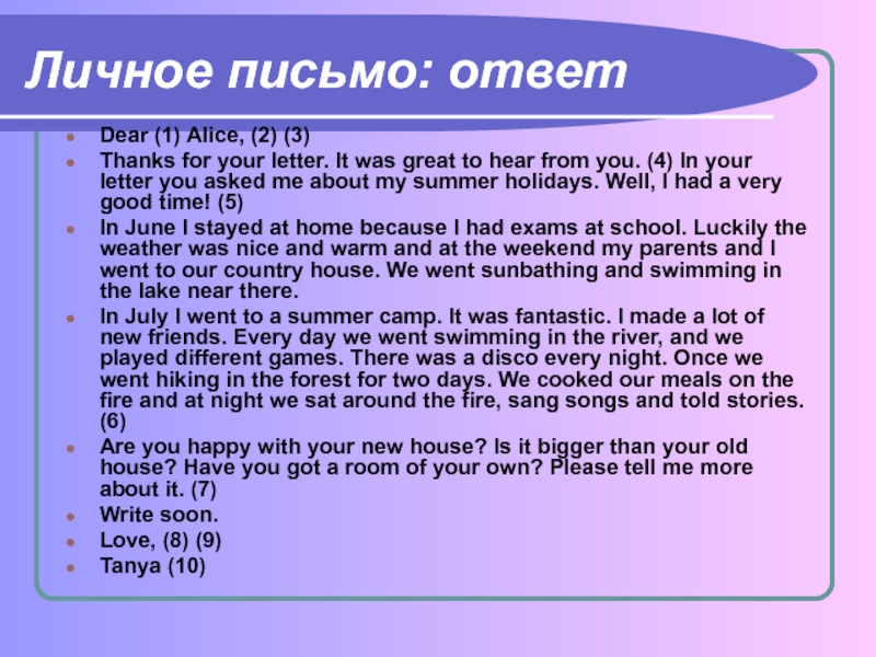 It was great to hear from you. (4) In your letter you asked me about my summer holidays. Well, I had a very good time! (5)