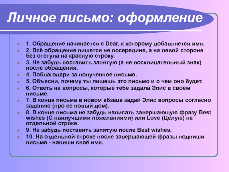 10. На отдельной строке после завершающей фразы подпиши письмо - напиши своё имя.