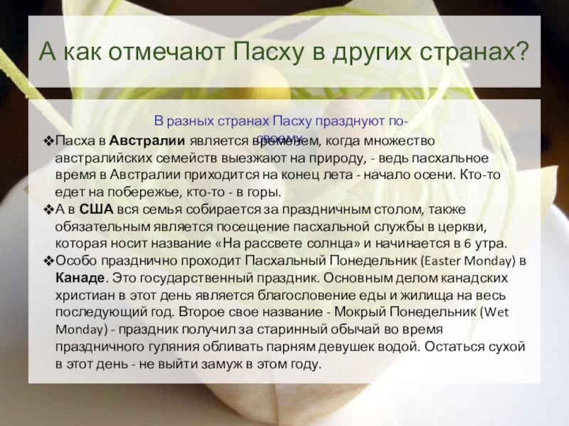 Особо празднично проходит Пасхальный Понедельник (Easter Monday) в Канаде. Это государственный праздник. Основным делом канадских христиан в этот день является благословение еды и жилища на весь последующий год. Второе свое название - Мокрый Понедельник (Wet Monday) - праздник получил за старинный обычай во время праздничного гуляния обливать парням девушек водой. Остаться сухой в этот день - не выйти замуж в этом году.