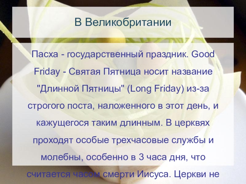 А в США вся семья собирается за праздничным столом, также обязательным является посещение пасхальной службы в церкви, которая носит название «На рассвете солнца» и начинается в 6 утра.
