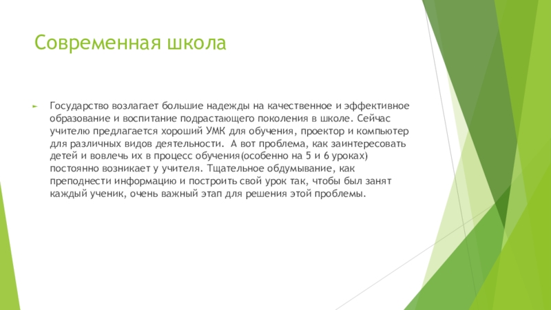 Современная школаГосударство возлагает большие надежды на качественное и эффективное образование и воспитание подрастающего поколения в школе. Сейчас учителю предлагается хороший УМК для обучения, проектор и компьютер для различных видов деятельности. А вот проблема, как заинтересовать детей