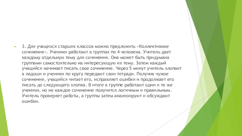 в группах по 4 человека. Учитель дает каждому отдельную тему для сочинения. Она может быть придумана группами самостоятельно на интересующую их тему. Затем каждый учащийся начинает писать свое сочинение. Через 5 минут учитель хлопает в ладоши и ученики по кругу передают свои тетради. Получив чужое сочинение, учащийся читает его, исправляет ошибки и продолжает его писать до следующего хлопка. В итоге в группе работают одни и те же ученики, но не каждое сочинение получится логичным и правильным. Учитель проверяет работы, а группы затем анализируют и обсуждают ошибки.