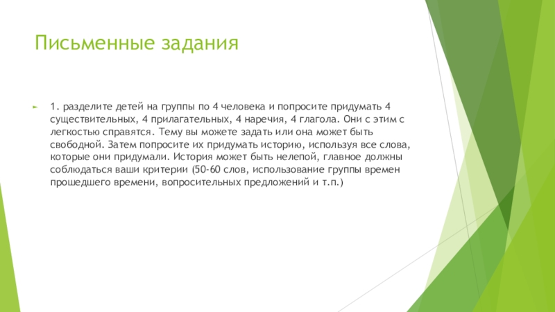 Письменные задания1. разделите детей на группы по 4 человека и попросите придумать 4 существительных, 4 прилагательных, 4