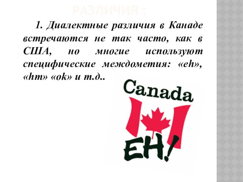 Различия :   1. Диалектные различия в Канаде встречаются не так часто, как в США, но