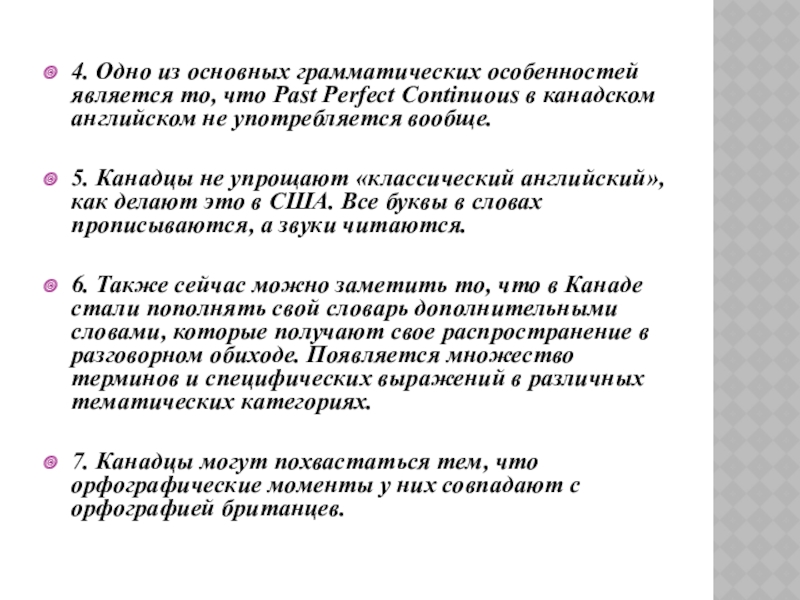 4. Одно из основных грамматических особенностей является то, что Past Perfect Continuous в канадском английском не употребляется
