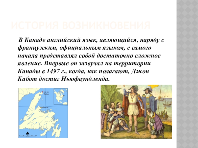 официальным языком, с самого начала представлял собой достаточно сложное явление. Впервые он зазвучал на территории Канады в 1497 г., когда, как полагают, Джон Кабот достиг Ньюфаундленда.