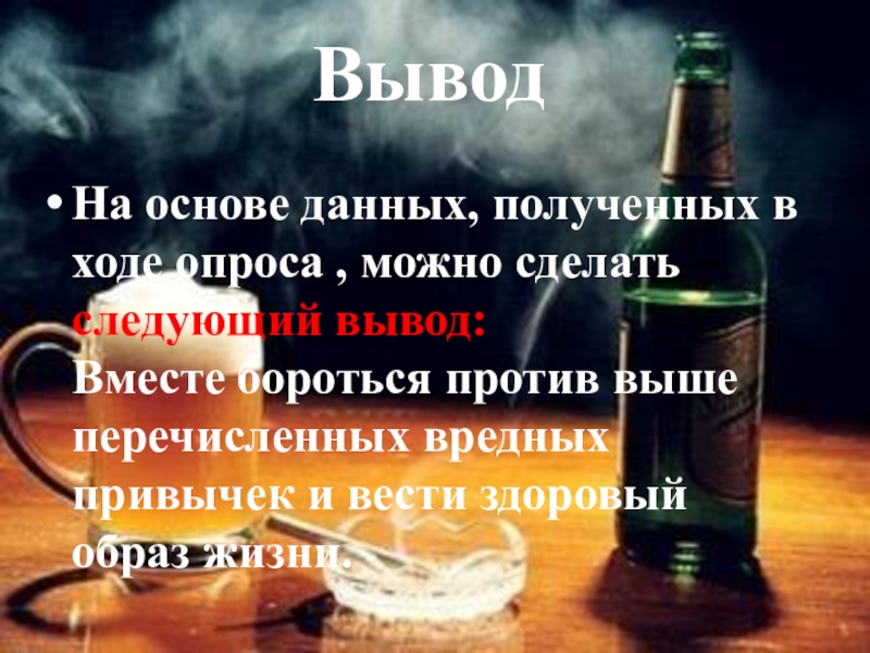 вывод: Вместе бороться против выше перечисленных вредных привычек и вести здоровый образ жизни.