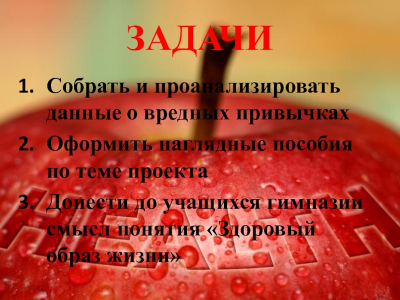 ЗАДАЧИСобрать и проанализировать данные о вредных привычкахОформить наглядные пособия по теме проектаДонести до учащихся гимназии смысл понятия