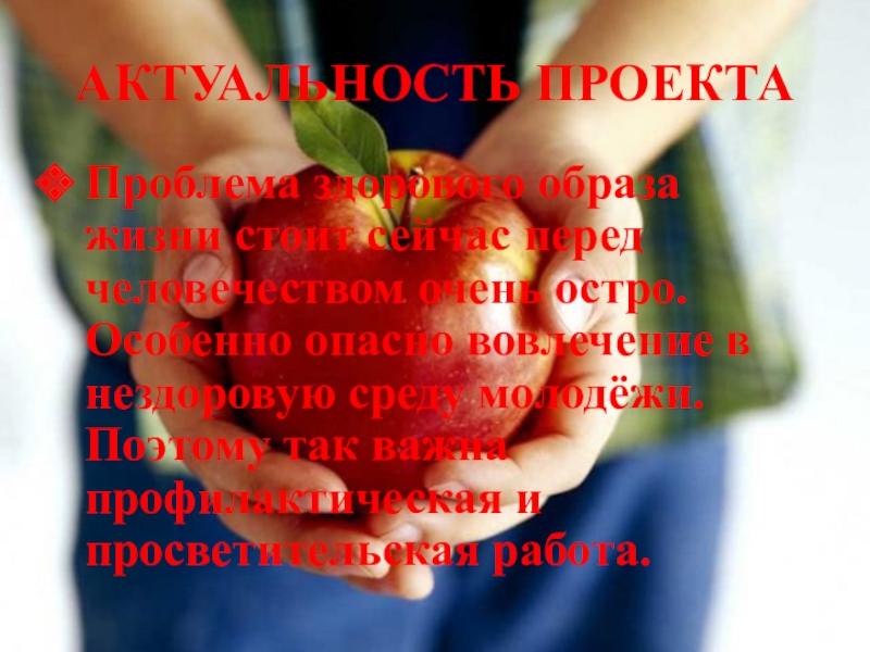 АКТУАЛЬНОСТЬ ПРОЕКТАПроблема здорового образа жизни стоит сейчас перед человечеством очень остро. Особенно опасно вовлечение в нездоровую среду