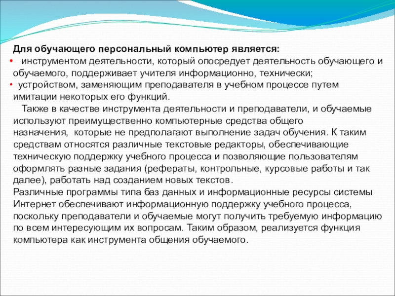 Слайд 3Персональный компьютер может рассматриваться в качестве одного из участников учебного процесса