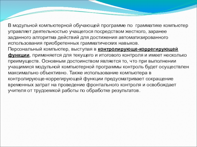 Слайд 12В модульной компьютерной обучающей программе по грамматике компьютер управляет деятельностью учащегося