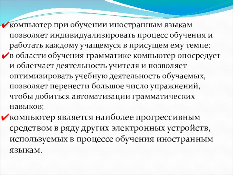 компьютер при обучении иностранным языкам позволяет индивидуализировать процесс обучения и работать