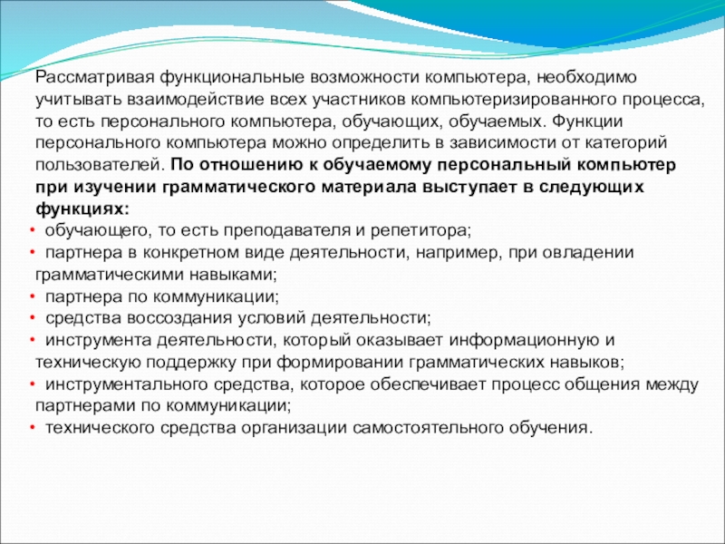 то есть персонального компьютера, обучающих, обучаемых. Функции персонального компьютера можно определить в зависимости от категорий пользователей. По отношению к обучаемому персональный компьютер при изучении грамматического материала выступает в следующих функциях: