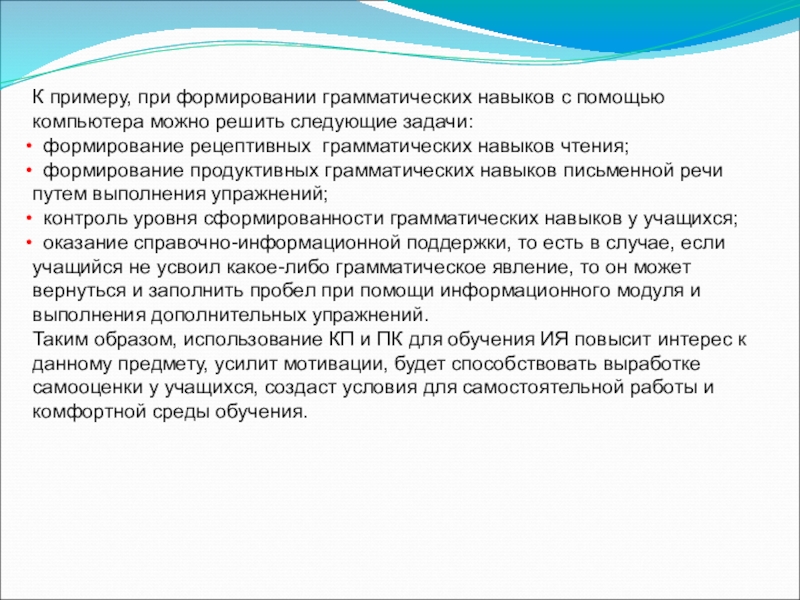 в области обучения грамматике компьютер опосредует и облегчает деятельность учителя и позволяет оптимизировать учебную деятельность обучаемых, позволяет перенести большое число упражнений, чтобы добиться автоматизации грамматических навыков;