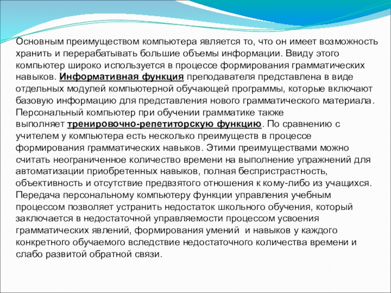 перерабатывать большие объемы информации. Ввиду этого компьютер широко используется в процессе формирования грамматических навыков. Информативная функция преподавателя представлена в виде отдельных модулей компьютерной обучающей программы, которые включают базовую информацию для представления нового грамматического материала. Персональный компьютер при обучении грамматике также выполняет тренировочно-репетиторскую функцию. По сравнению с учителем у компьютера есть несколько преимуществ в процессе формирования грамматических навыков. Этими преимуществами можно считать неограниченное количество времени на выполнение упражнений для автоматизации приобретенных навыков, полная беспристрастность, объективность и отсутствие предвзятого отношения к кому-либо из учащихся. Передача персональному компьютеру функции управления учебным процессом позволяет устранить недостаток школьного обучения, который заключается в недостаточной управляемости процессом усвоения грамматических явлений, формирования умений и навыков у каждого конкретного обучаемого вследствие недостаточного количества времени и слабо развитой обратной связи.