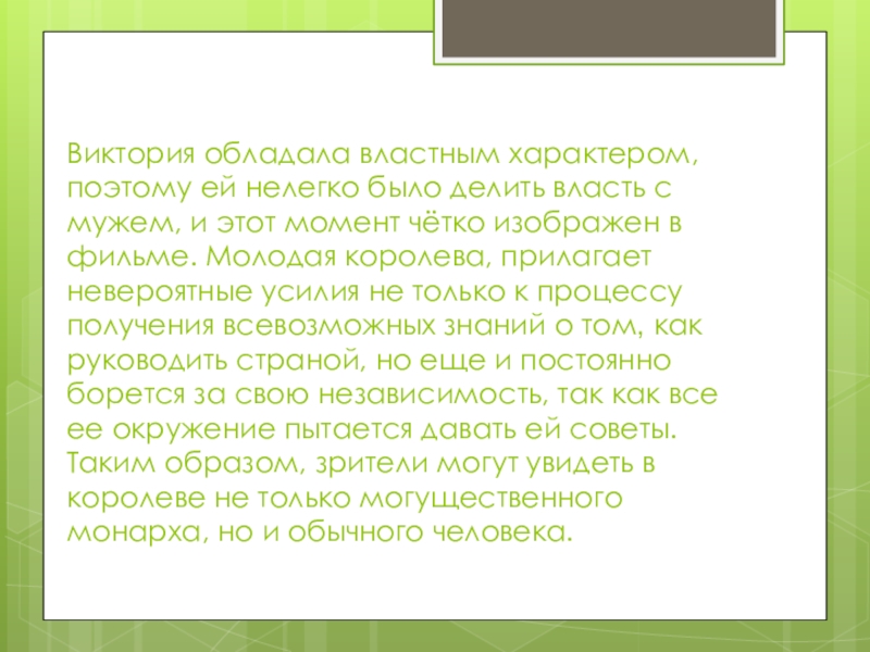 мужем, и этот момент чётко изображен в фильме. Молодая королева, прилагает невероятные усилия не только к процессу получения всевозможных знаний о том, как руководить страной, но еще и постоянно борется за свою независимость, так как все ее окружение пытается давать ей советы. Таким образом, зрители могут увидеть в королеве не только могущественного монарха, но и обычного человека.