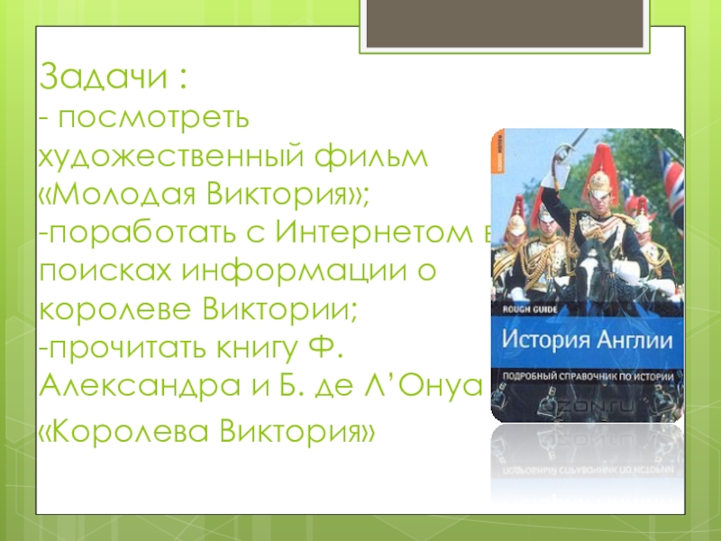 Слайд 5 Задачи : - посмотреть художественный фильм «Молодая Виктория»; -поработать с Интернетом в поисках