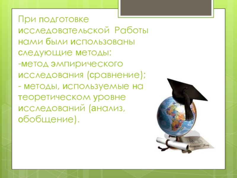 Слайд 8При подготовке исследовательской Работы нами были использованы следующие методы: -метод эмпирического