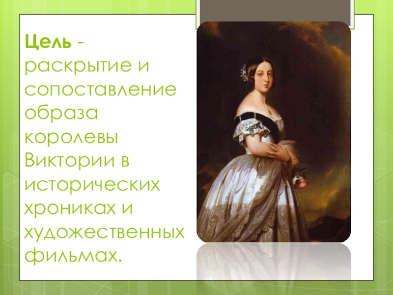 Цель - раскрытие и сопоставление образа королевы Виктории в исторических хрониках и художественных фильмах.