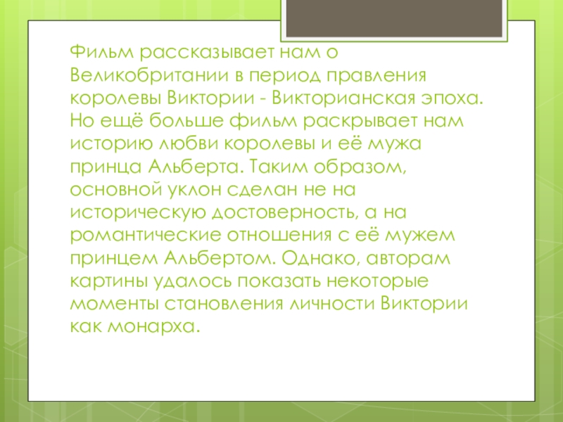 Слайд 24Фильм рассказывает нам о Великобритании в период правления королевы Виктории -