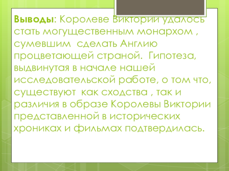 Выводы: Королеве Виктории удалось стать могущественным монархом , сумевшим сделать Англию процветающей страной. Гипотеза, выдвинутая в начале