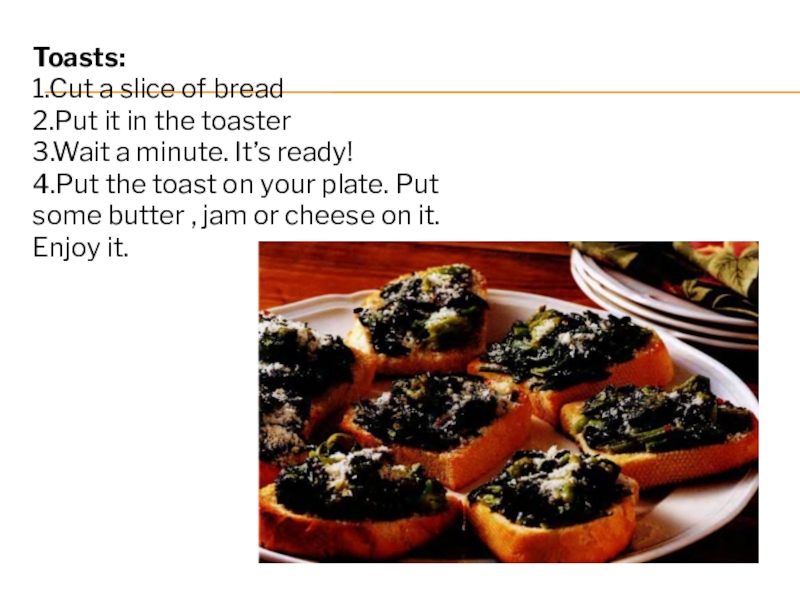 Toasts:1.Cut a slice of bread2.Put it in the toaster3.Wait a minute. It’s ready!4.Put the toast on your plate. Put some butter , jam or cheese on it. Enjoy it.