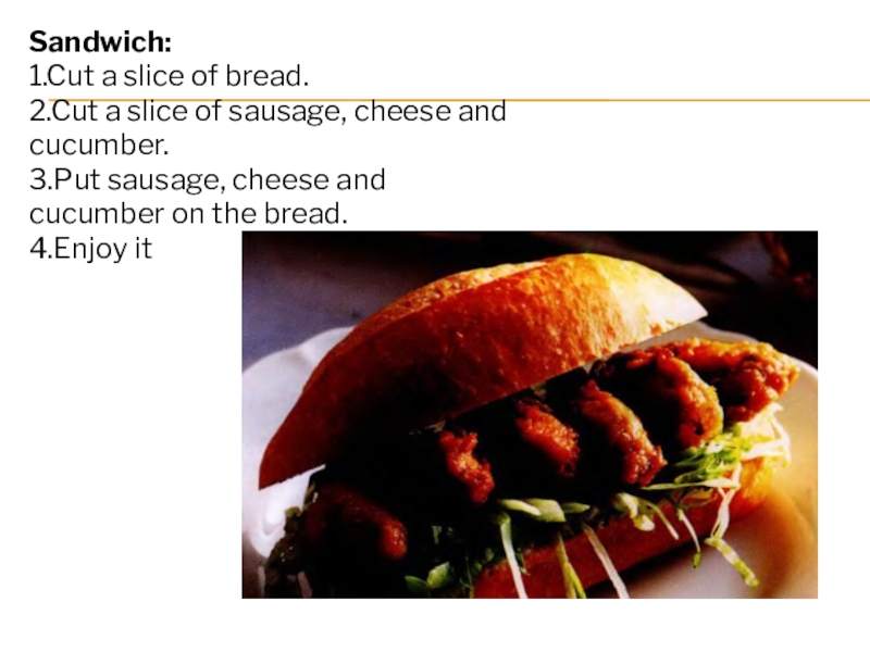 Sandwich:1.Cut a slice of bread.2.Cut a slice of sausage, cheese and cucumber.3.Put sausage, cheese and cucumber on