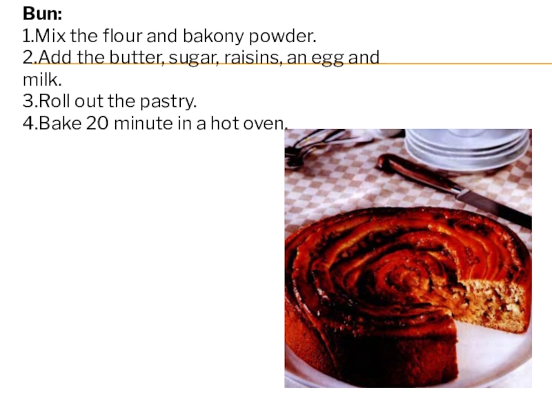 Bun:1.Mix the flour and bakony powder.2.Add the butter, sugar, raisins, an egg and milk.3.Roll out the pastry.4.Bake