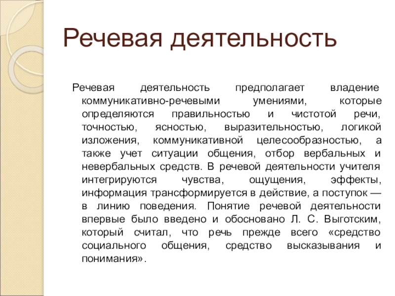 чистотой речи, точностью, ясностью, выразительностью, логикой изложения, коммуникативной целесообразностью, а также учет ситуации общения, отбор вербальных и невербальных средств. В речевой деятельности учителя интегрируются чувства, ощущения, эффекты, информация трансформируется в действие, а поступок — в линию поведения. Понятие речевой деятельности впервые было введено и обосновано Л. С. Выготским, который считал, что речь прежде всего «средство социального общения, средство высказывания и понимания».