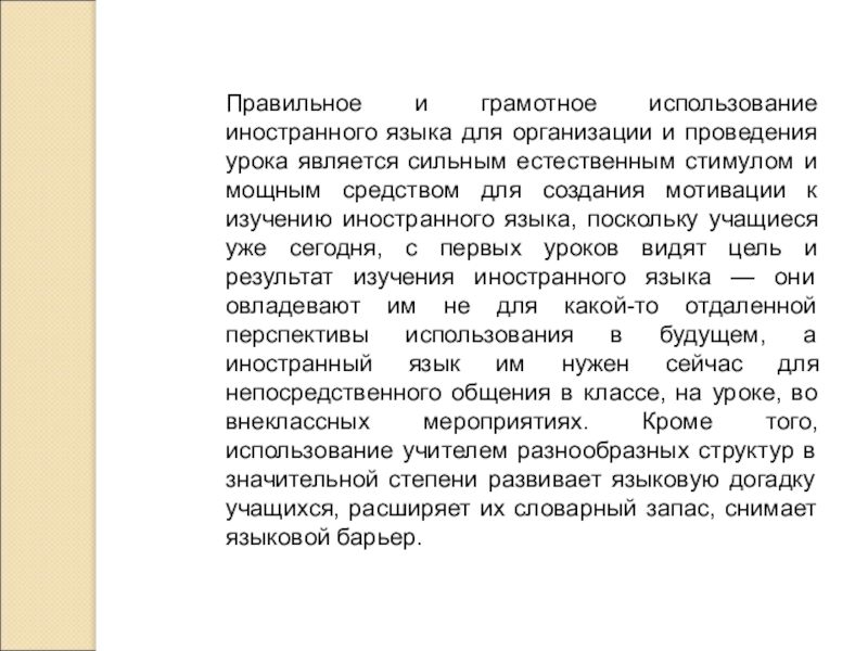 является сильным естественным стимулом и мощным средством для создания мотивации к изучению иностранного языка, поскольку учащиеся уже сегодня, с первых уроков видят цель и результат изучения иностранного языка — они овладевают им не для какой-то отдаленной перспективы использования в будущем, а иностранный язык им нужен сейчас для непосредственного общения в классе, на уроке, во внеклассных мероприятиях. Кроме того, использование учителем разнообразных структур в значительной степени развивает языковую догадку учащихся, расширяет их словарный запас, снимает языковой барьер.