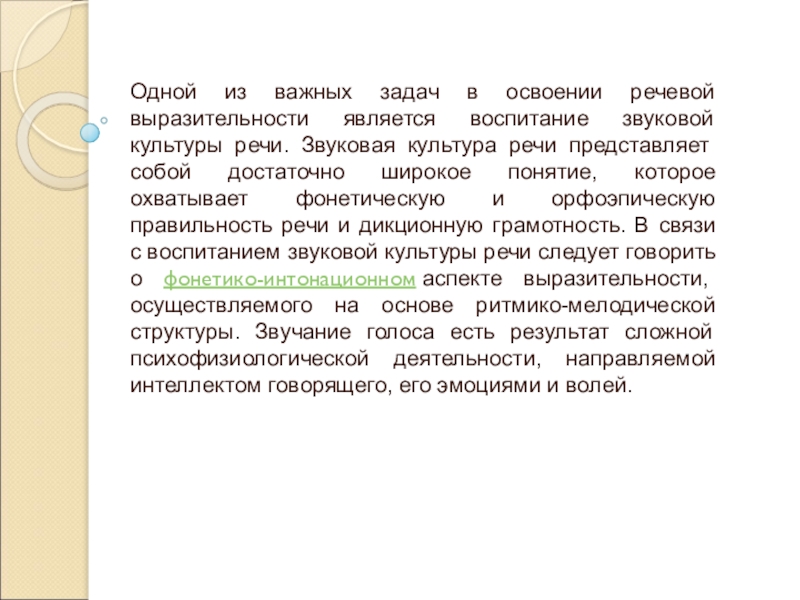 культуры речи. Звуковая культура речи представляет собой достаточно широкое понятие, которое охватывает фонетическую и орфоэпическую правильность речи и дикционную грамотность. В связи с воспитанием звуковой культуры речи следует говорить о фонетико-интонационном аспекте выразительности, осуществляемого на основе ритмико-мелодической структуры. Звучание голоса есть результат сложной психофизиологической деятельности, направляемой интеллектом говорящего, его эмоциями и волей.