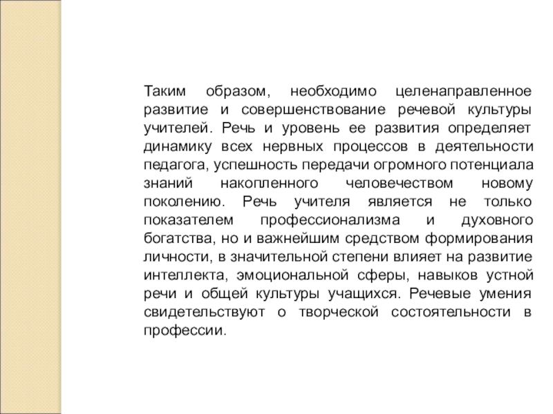 Слайд 14Таким образом, необходимо целенаправленное развитие и совершенствование речевой культуры учителей. Речь